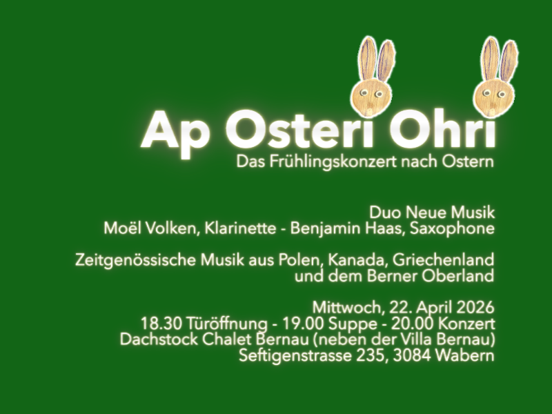 22 April 2026 - "Ap Osteri Ohri” with Duo Neue Musik @ Chalet Bernau, Wabern